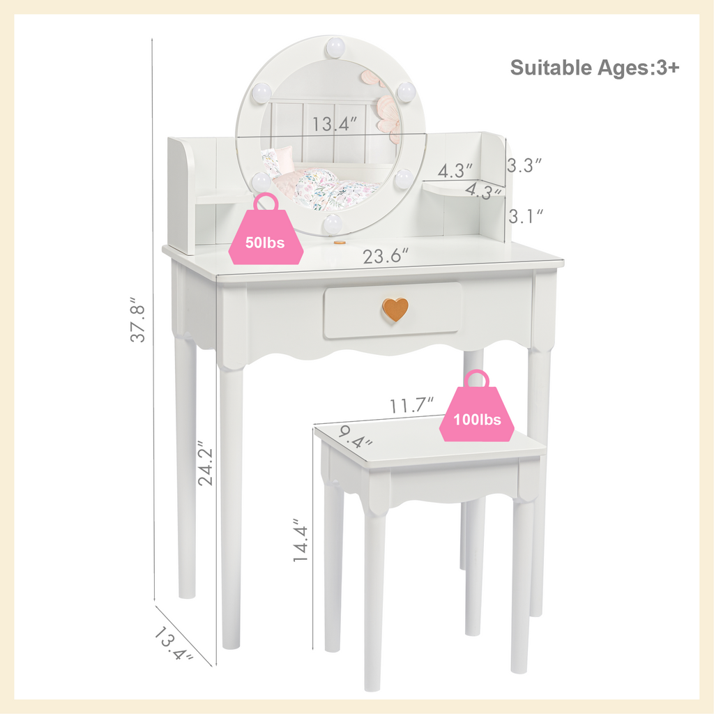 【PERFECT SIZE】: This kids makeup vanity overall size: Vanity-23.6Wx13.4Wx37.8H, Stool-11.7Lx9.4Wx14.4H inches, Designed with kids in mind,which is the perfect size for kids aged 3+ years, give your little princess the perfect place to get ready with this kids vanity set with mirror.