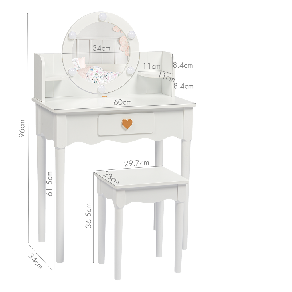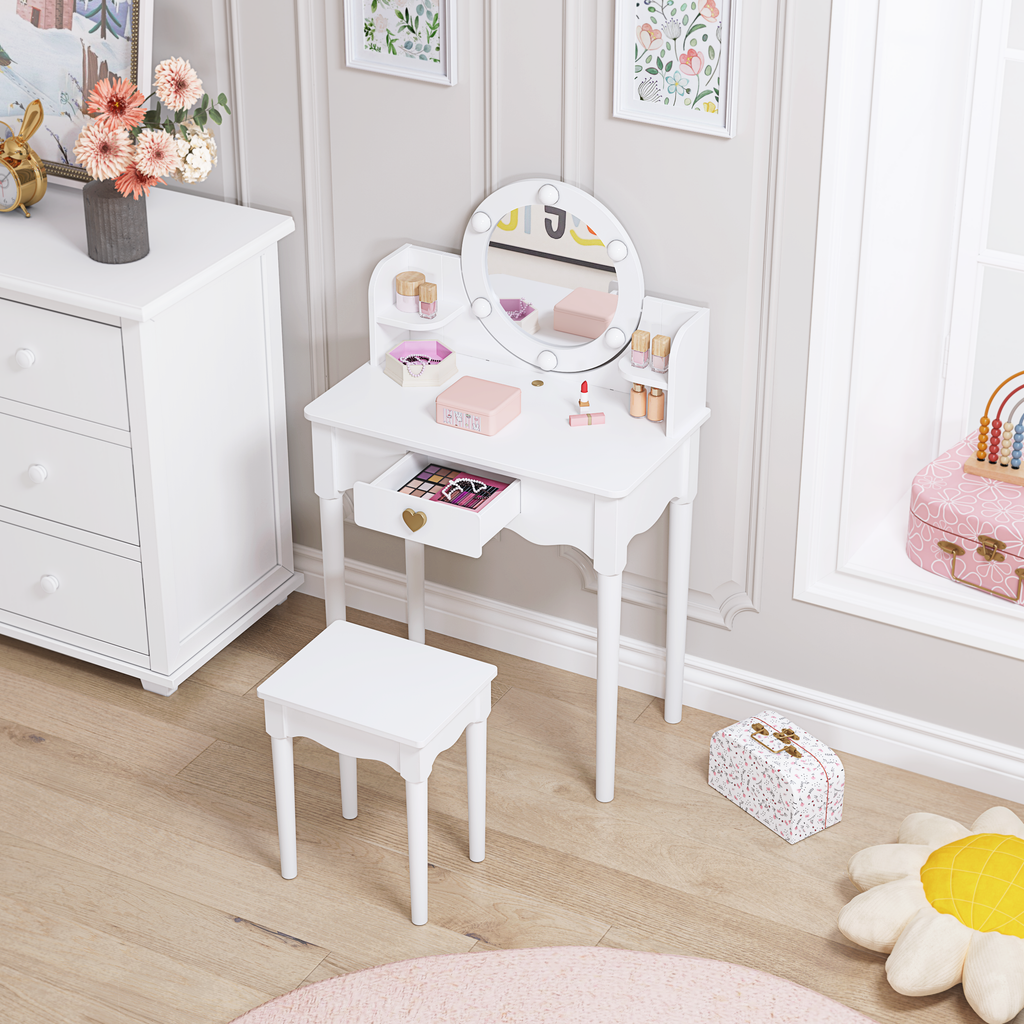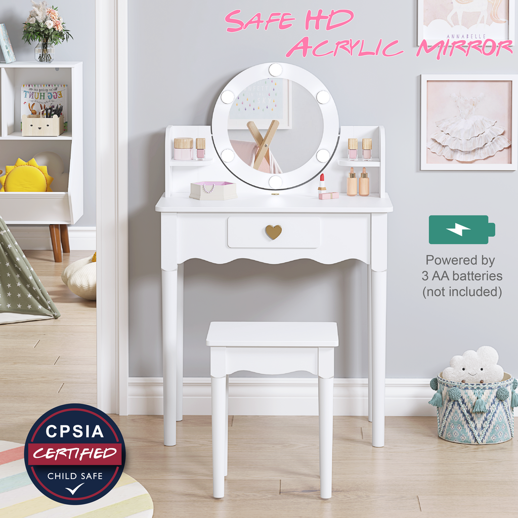 【LED BULBS & HIGH QUALITY ACRYLIC MIRROR】: The girls vanity set center mirror is surrounded with 6 LED lights, offering soft light to illuminate the child's face. An Quality high definition and safe round mirror allow kids to observe their makeup and hairstyle conveniently. The Exquisite appearance and beautiful lights, make your kid's princess dream come true.