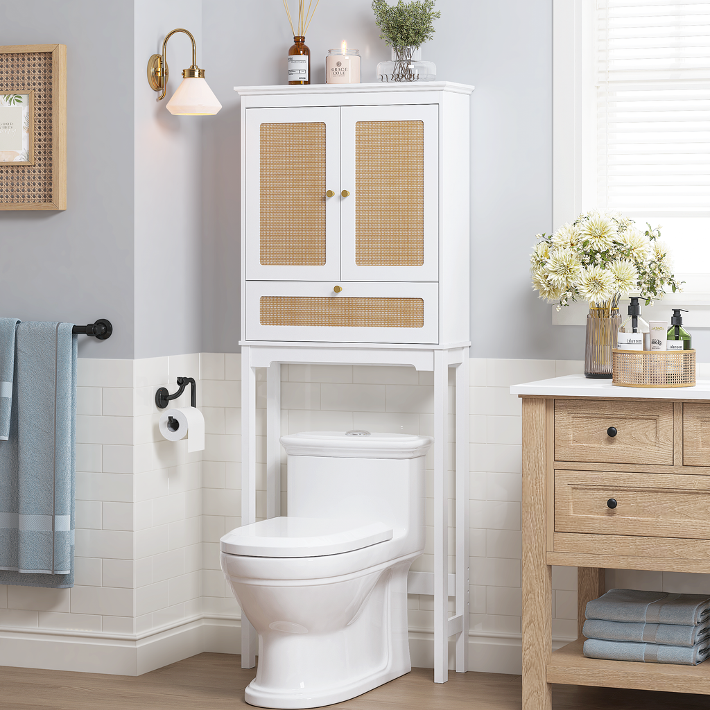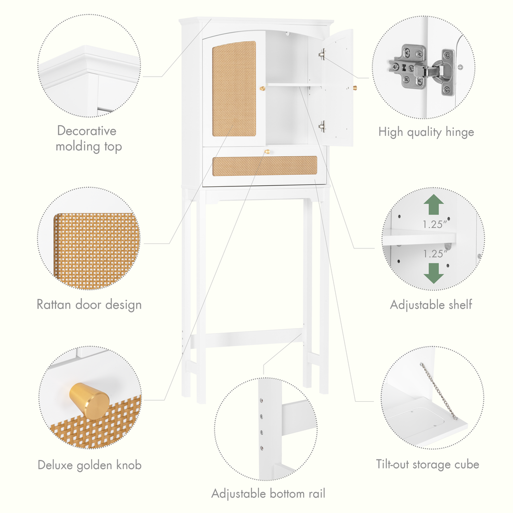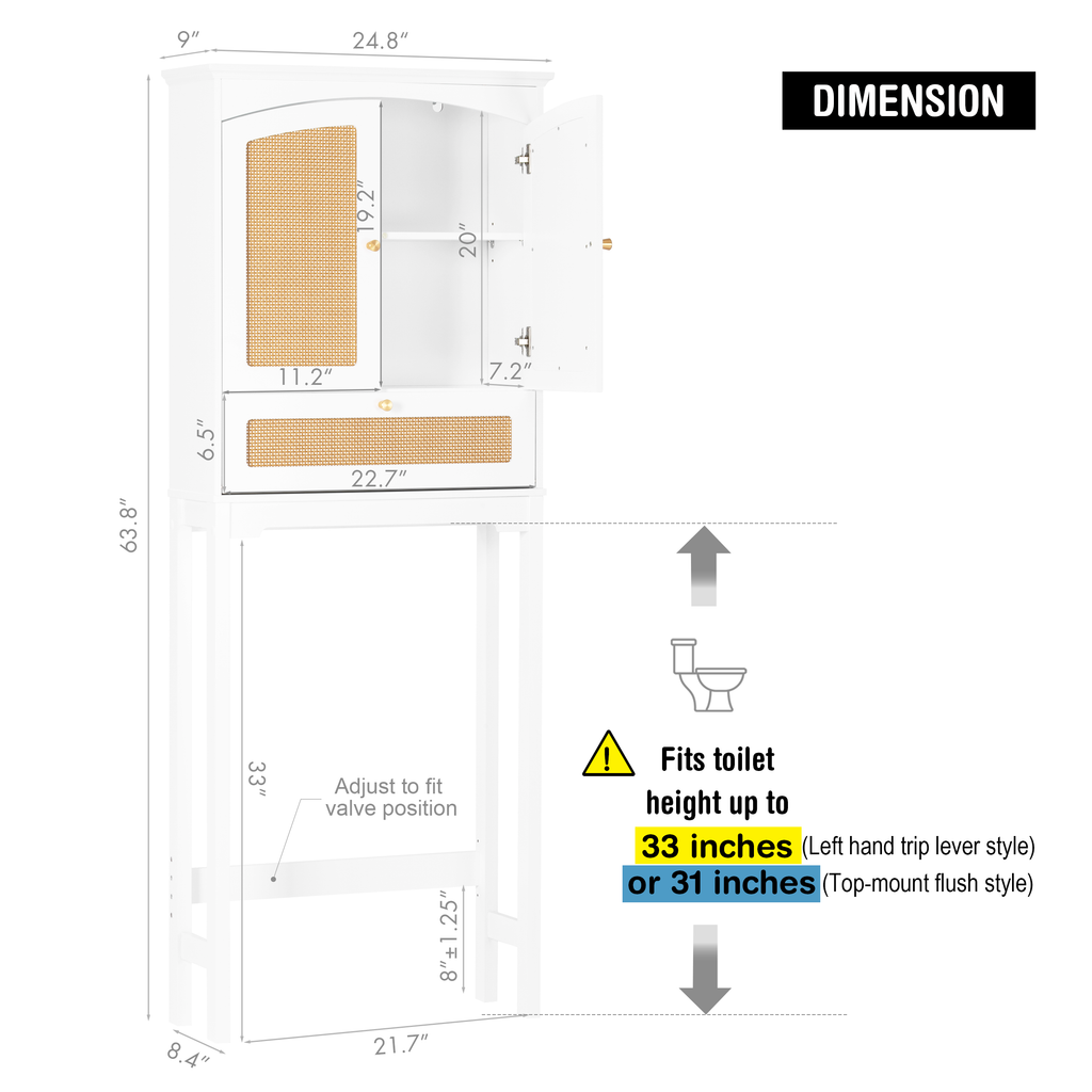 Organic Glam Design: Upgrade your bathroom with Spirich over the toilet storage cabinet featuring hand-woven PE rattan doors and gleaming golden knobs. This over the toilet shelf blends natural texture and modern elegance, transforming plain walls into a stylish focal point. Vertical Space Maximizer: Engineered with an adjustable bottom bar (33'' shelf-to-floor clearance), this over toilet bathroom organizer adapts to most toilet heights. Optimize vertical space for towels, toiletries, or decor—ideal for apartments and compact bathrooms. Secure Anti-Tip Stability: Equipped with an adjustable wall bracket and weighted P2 MDF base, this bathroom over toilet storage cabinet prevents tipping. Safely store heavy items without shifting, ensuring daily use reliability. Flexible Storage Solutions: Customize storage with an adjustable interior shelf and tilt-out cube (built-in chain). Organize toiletries, cosmetics, or toilet paper effortlessly. The behind toilet bathroom organizer adapts to your needs. Quick & Easy Assembly: Pre-drilled holes, numbered parts, and clear instructions ensure frustration-free setup. Compact dimensions (24.6"W x 9"D x 63.8"H) fit seamlessly above toilets—upgrade your space in minutes! FSC-CERTIFIED WOOD: The above toilet storage cabinet is crafted with FSC-certified wood, meeting global standards for forest conservation. |