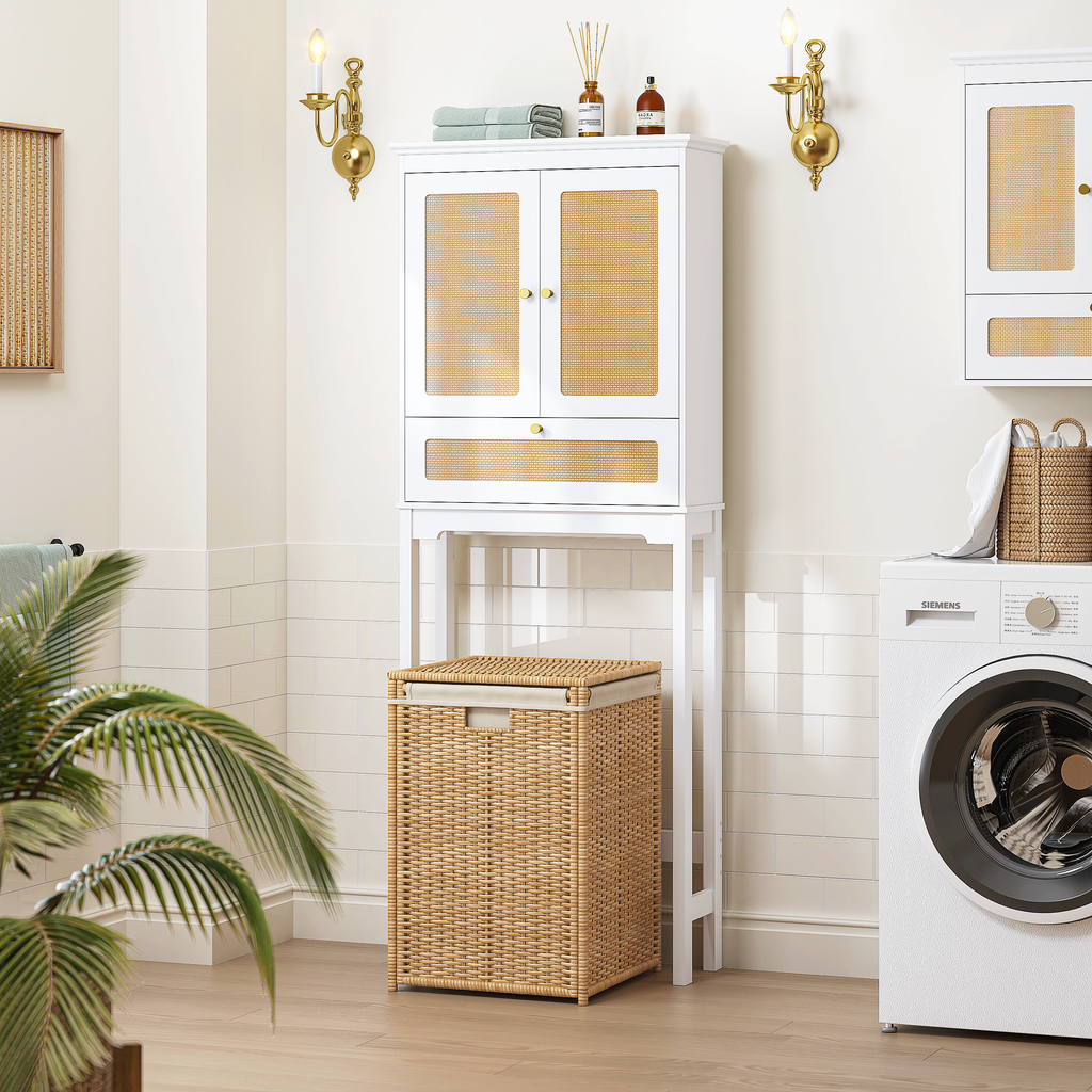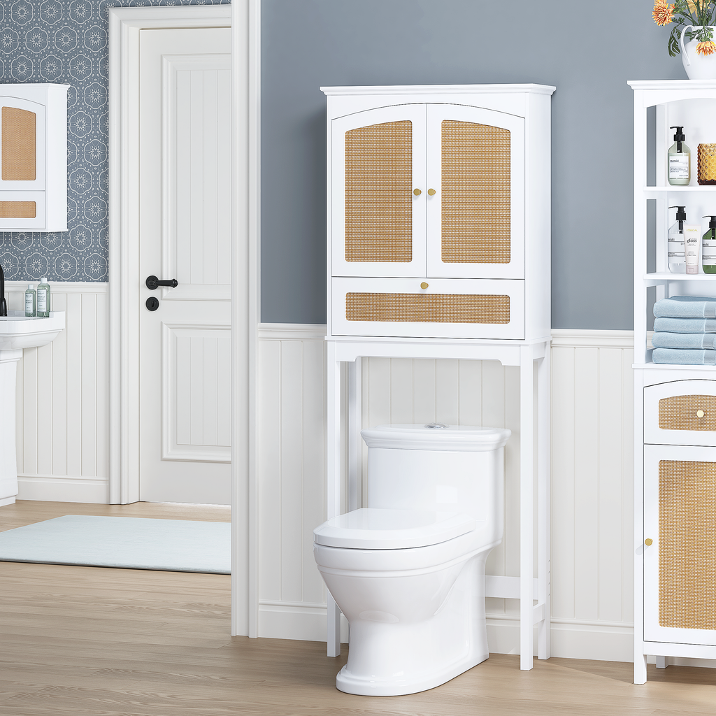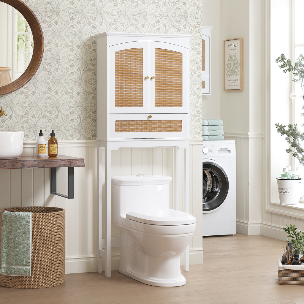 Organic Glam Design: Upgrade your bathroom with Spirich over the toilet storage cabinet featuring hand-woven PE rattan doors and gleaming golden knobs. This over the toilet shelf blends natural texture and modern elegance, transforming plain walls into a stylish focal point. Vertical Space Maximizer: Engineered with an adjustable bottom bar (33'' shelf-to-floor clearance), this over toilet bathroom organizer adapts to most toilet heights. Optimize vertical space for towels, toiletries, or decor—ideal for apartments and compact bathrooms. Secure Anti-Tip Stability: Equipped with an adjustable wall bracket and weighted P2 MDF base, this bathroom over toilet storage cabinet prevents tipping. Safely store heavy items without shifting, ensuring daily use reliability. Flexible Storage Solutions: Customize storage with an adjustable interior shelf and tilt-out cube (built-in chain). Organize toiletries, cosmetics, or toilet paper effortlessly. The behind toilet bathroom organizer adapts to your needs. Quick & Easy Assembly: Pre-drilled holes, numbered parts, and clear instructions ensure frustration-free setup. Compact dimensions (24.6"W x 9"D x 63.8"H) fit seamlessly above toilets—upgrade your space in minutes! FSC-CERTIFIED WOOD: The above toilet storage cabinet is crafted with FSC-certified wood, meeting global standards for forest conservation. |